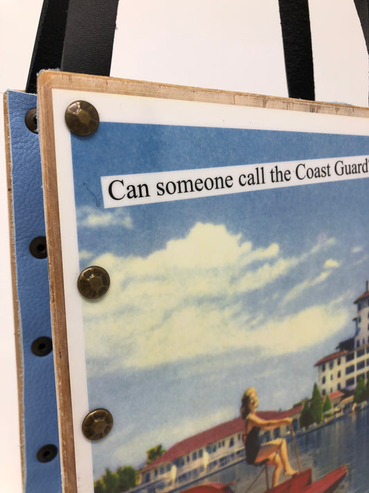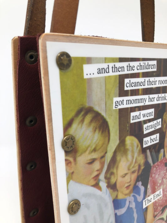 These are adorable and funny handbags - perfect for taking a few essential items with you to the store or a dinner party! They were created by repurposing pages from a cute coffee table book and then pairing them with coordinating leather inserts and upgraded leather handles. For those of you with a sense of humor, this is a perfect handbag for you!