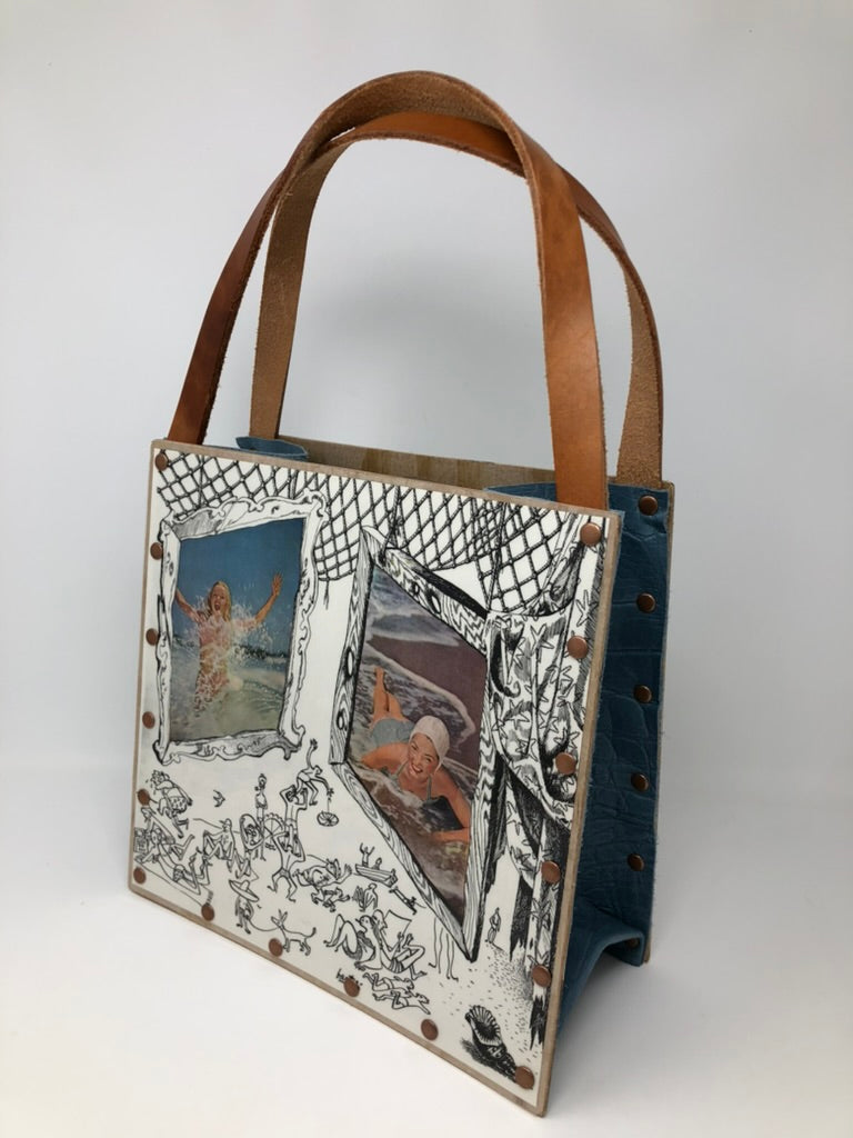 This is a super fun small tote bag showcasing photographs and artwork from a vintage June 1948 Holiday magazine! This is a one of a kind, 100% handcrafted vintage magazine tote bag created using original Holiday article pages from June 1948. The front cover celebrates ocean fun and the back cover features beach sunbathers, both from the actual magazine. This tote is constructed with laminated graphics attached to wood veneer and then hand riveted with coordinating copper metal rivets. The side and bottom panels are hand tooled with an upgraded blue embossed leather insert and the straps are a 17" sturdy natural leather. This unique tote measures approximately 10 1/2" wide by 10" in height. Take your Holiday to the beach!