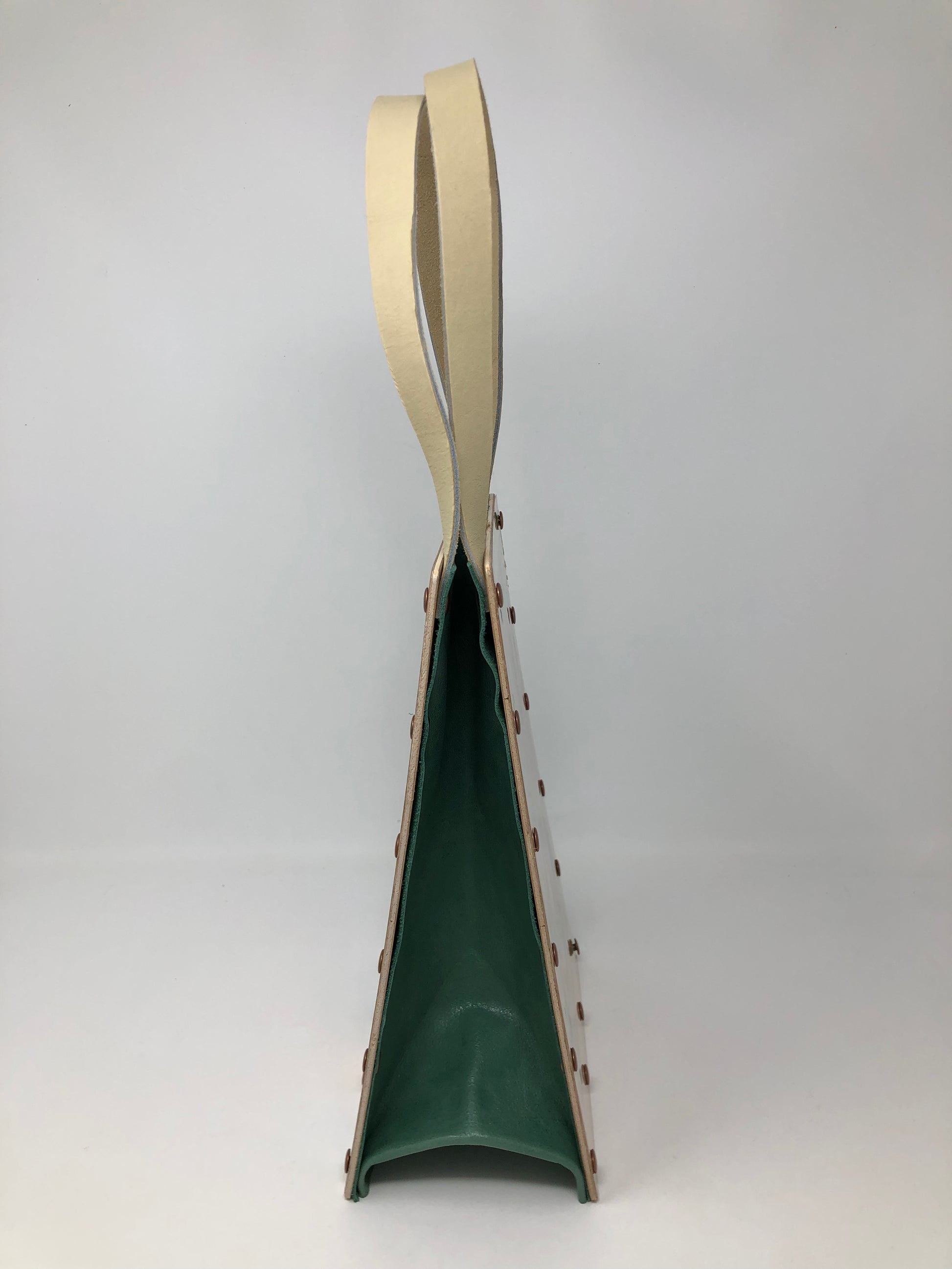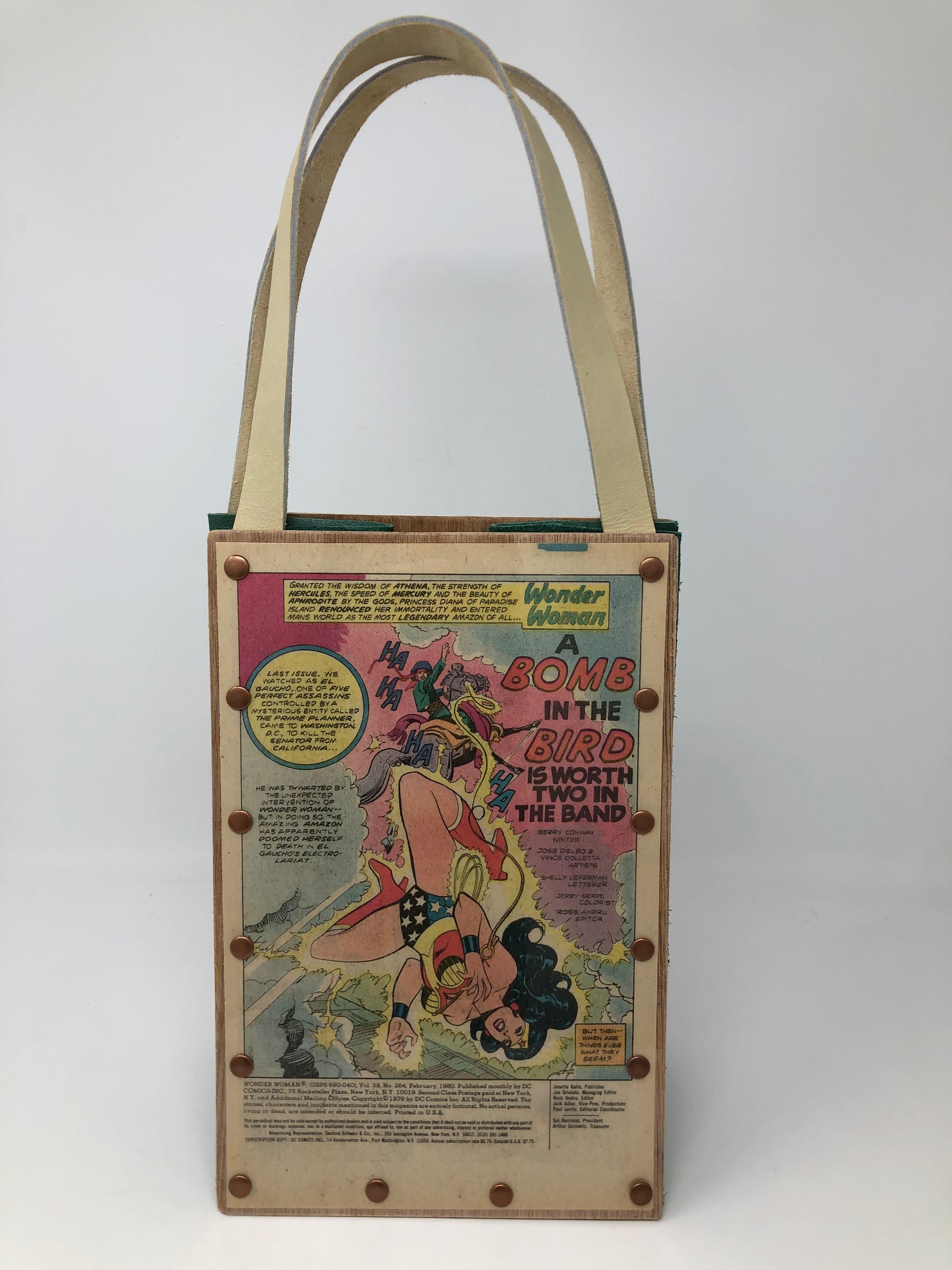 Princess Diana of Paradise Island renounces her immortality! This is a one of a kind, 100% handcrafted vintage comic book purse made out of an original Wonder Woman comic book from February 1980. This purse is constructed with a laminated graphic attached to wood veneer and then hand riveted with coordinating brushed copper metal rivets. The side and bottom panels are made with a beautiful sea foam green leather insert, the handles are a supple light natural colored leather and it measures approximately 7" wide by 10 1/2" in height. Make this amazing Amazon princess purse yours today!